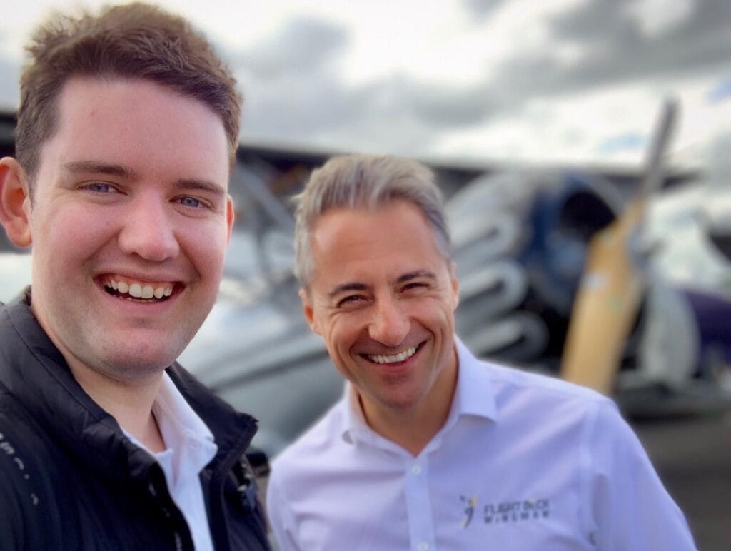 YouTube star ‘Plane Old Ben’ in the foreground, with Andrew from Flight Deck Wingman in 2019 following Ben’s successful application to his first Airline job with FlyBe.